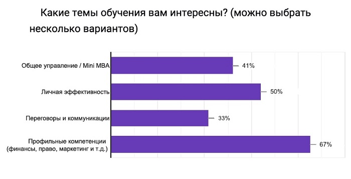 Кроме того, участников опроса интересуют темы личной эффективности (50%) и управления (41%). А вот переговорам и коммуникациям они уделяют гораздо меньше внимания (33%).