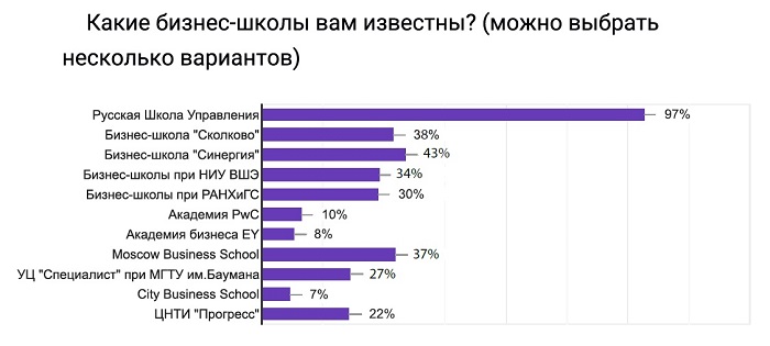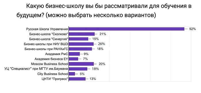 В рамках исследования рассматривалась и популярность российских бизнес-школ. По итогам опроса, лучше всего респондентам знакома Русская Школа Управления (97%). Она же стала лидером среди бизнес-школ, в которых участники опроса планируют учиться в будущем (92%).